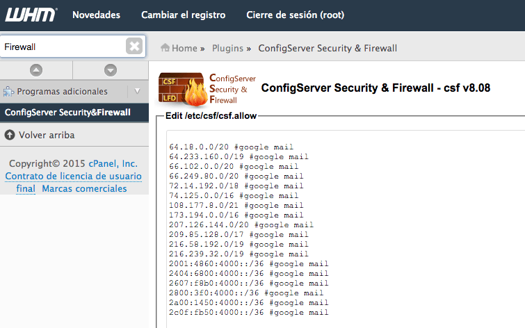 Por ejemplo, considerando que utilice CSF Firewall en WHM de Cpanel